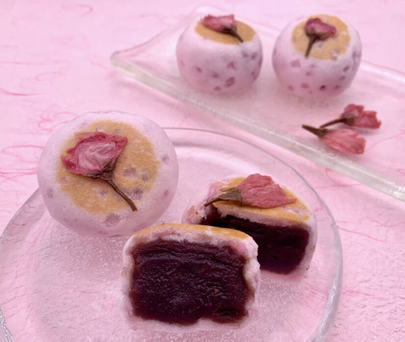 桜餡を包んで桜花塩漬けをのせた春を感じるお饅頭です。